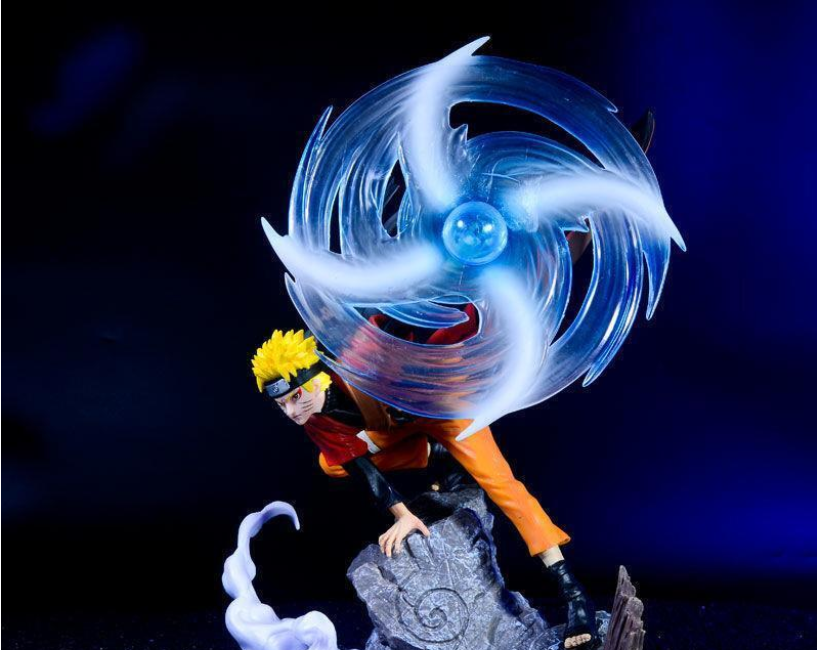 The action figure is a detailed representation of Naruto Uzumaki from the "Naruto Shippuden" anime series. It features him performing the Rasengan, a signature spiraling chakra ball technique. This figure would capture Naruto in a dynamic pose, emphasizing the motion and energy involved in executing the Rasengan. The design would likely include Naruto's iconic orange jumpsuit and headband with the leaf village symbol. Attention would be given to the detailing of his facial expressions, showing concentration and determination. The Rasengan itself would be a focal point, possibly crafted to appear as a swirling, translucent sphere in his hand, illustrating the power and movement of the technique. This figure would be a vivid portrayal of Naruto's character and his mastery of the Rasengan. approximately 32 cm in height